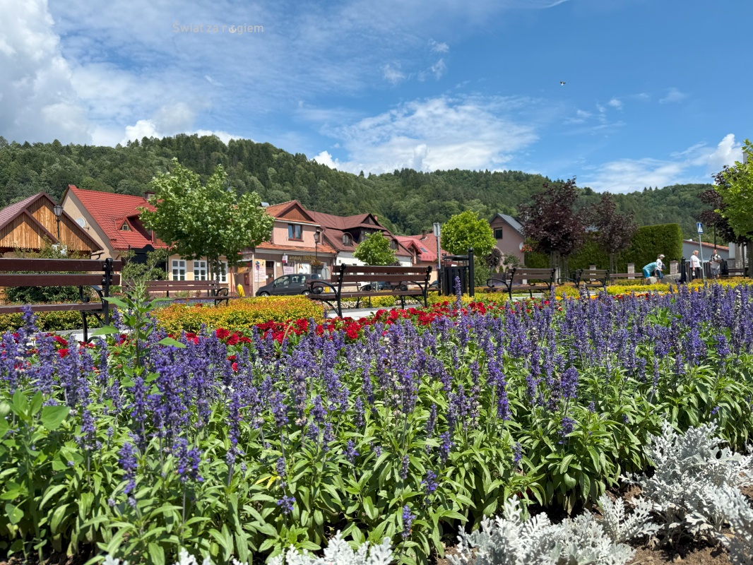 Po ok. 11 km takiej wygodnej jazdy dotrzecie do kolejnego uzdrowiska, Muszyna Zdrój. Rynek przyjemny, też pełen kwiatów, ale ciekawe miejsce jest nieco oddalone od centrum. Ogrody Sensoryczne, to doskonałe miejsce na relaks. Znajdziecie tutaj zadbaną przestrzeń, idealną na chwilę relaksu czy spacer. To przestronny park, podzielony na strefy: dźwięku, zapachu, dotyku. To też świetna panorama na dolinę Popradu. Idealne miejsce na pit stop po pierwszej godzinie jazdy z sakwami. Można tu też uzupełnić wodę, zjeść coś lekkiego i przygotować się na kolejny odcinek trasy.